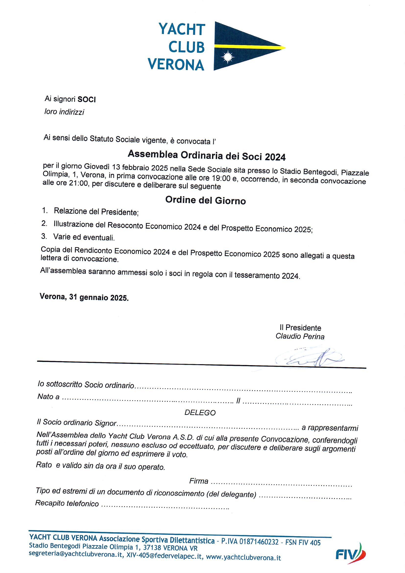E' convocata l'Assemblea Ordinaria dei Soci 2024 per Giovedì 13 febbraio 2024 alle ore 19.00 in prima convocazione e alle ore 21.00 in seconda convocazione presso la sede sociale allo Stadio Bentegodi.